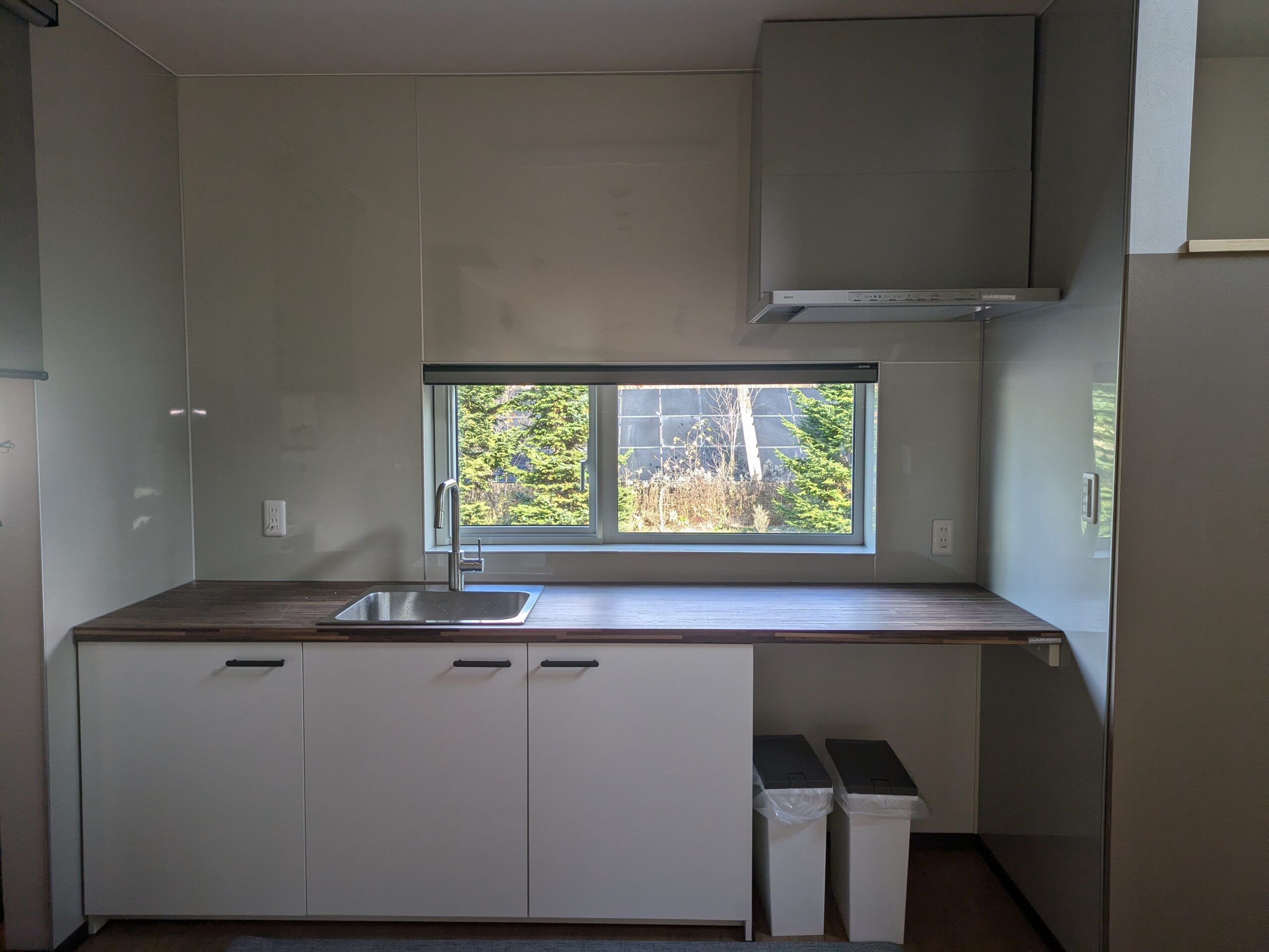 油まみれだったL字型キッチンは、右の部屋の壁をなくし、換気扇・水栓の位置を変えてI型キッチンへ。キッチンは施主様支給のイケア製品です。キッチンパネルも全て取り替え、綺麗な明るいキッチンに変わりました。民泊仕様のため、あえてガスは引かず置き型IHを置く予定だそうです。